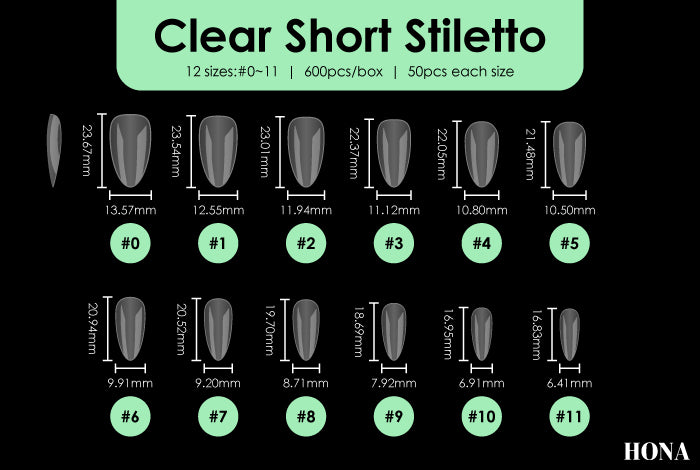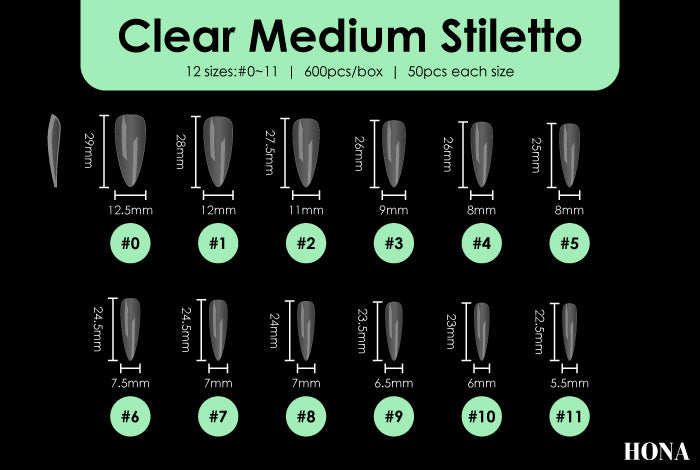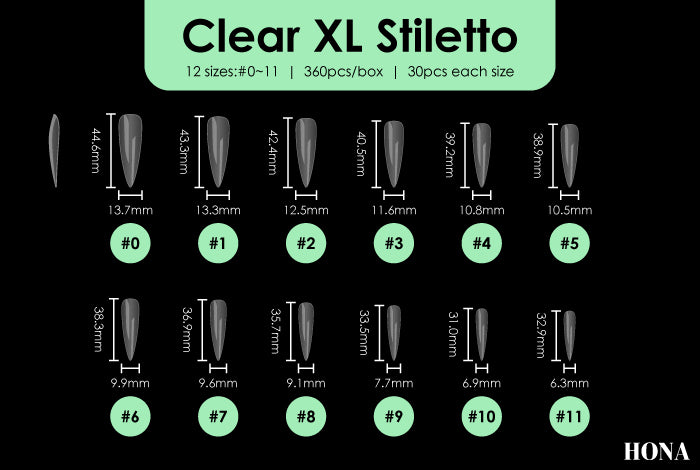 Clear Short Stiletto tip measurementsClear Medium Stiletto tip measurementsClear Long Stiletto tip measurementsClear XL Stiletto tip measurementsMatte Short Stiletto tip measurementsMatte Medium Stiletto tip measurementsMatte Long Stiletto tip measurements